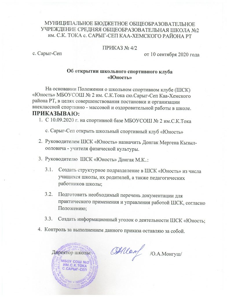 Школьный спортивный клуб «Юность» ЛицензияСкачать Приказ о создании ШСКСкачать ПоложениеСкачать Протокол Скачать Устав ШСКСкачать КАЛЕНДАРНЫЙ-ПЛАН- спортивно-массовых мероприятий Республики-на-2023-2024-у-г.Скачать План-работы-ШСК-МБОУ-СОШ-№2-с.-Сарыг-Сеп-2023-2024Скачать План спортивно-массовых, физкультурно-спортивных и социально значимых мероприятий на учебный год 2021-2022Скачать Календарный план спортивно-массовых мероприятий района и республики.Скачать
