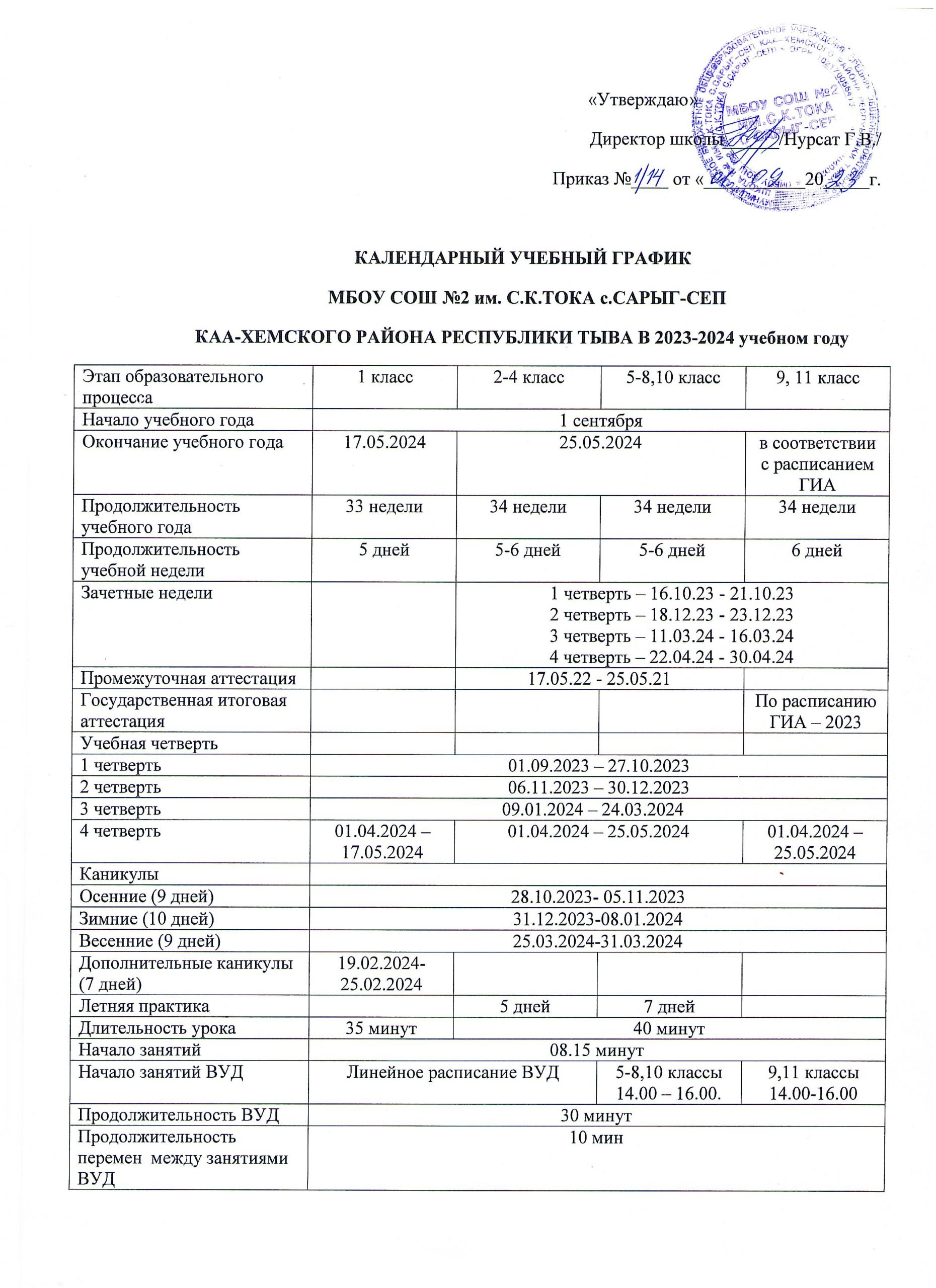 Образование Выписка из реестра лицензий-на-ОД(лицензия №17067 от 24.11.2021 года) Скачать Свидетельство об аккредитации ОД до 04.06.2027 Свидетельство аккредитацииСкачать Сведения-о-численности-обучающихся 2023-2024 годСкачать Обязательные локальные акты ОО Положение-о-языках обучения и изученияСкачать График-проведения-оценочных-процедур-на-2023-2024-уг.Скачать Реализуемые образовательные программы Информация-об образовательных программах школы-на-2022-2023-годСкачать Описание-образовательных-программСкачать Образовательные программы 2023-2024 год ОП-НОО-МБОУ-СОШ-№2-с.Сарыг-Сеп-Скачать ОП-ООО-МБОУ-СОШ-№2-с.Сарыг-Сеп-Скачать ОП-СОО-МБОУ-СОШ-№2-с.Сарыг-Сеп-Скачать РП-АОП-вариант-И-9.1.Скачать РП-АОП-вариант-О-9.2.Скачать Образовательные программы 2022-2023 год Учебный план 2023-2024 год : Календарный-учебный-график-2023-2024Скачать Учебный-план-НОО-С-С-№2-2023-2024Скачать Учебный-план-ООО-С-С-№2-2023-2024Скачать Учебный-план-СОО-С-С-№2-2023-2024Скачать Учебный-план-ОНД-С-С-№2-2023-2024Скачать Учебный-план-ОНД-С-С-№2-2022-2023Скачать Учебные планы 2022-2023 год Рабочие программы 2023-2024 год Положение-о-РП-2021-2022-Сарыг-Сеп-№2-1-1Скачать Планы воспитательной работы Программа воспитания 2023-2024 ггСкачать Календарный-план-ВР-1-4-клСкачать Календарный-план-ВР-5-9-клСкачать Календарный-план-ВР-10-11клСкачать Методические документы, материалы Рекомендации-по-работе-со-слабоуспевающимиСкачать Лист-контроля-работы-со-слабоуспевающимиСкачать Таблицы-по-работе-со-слабоуспевающимиСкачать лист-контроля-учителя-подготовка-к-ЕГЭСкачать разделы-методической папки учителя по подготовке к ГИАСкачать План экзаменационной работы ЕГЭ по биологии с баллами -2023Скачать Алгоритм-создания-теста-на-Гугл-ФормеСкачать
