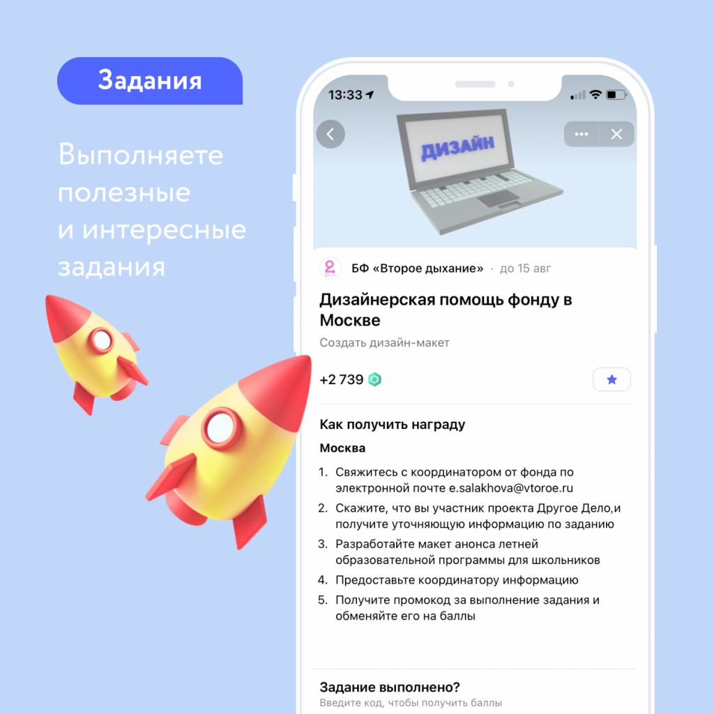Задания направлены на всестороннее развитие, социальную активность и здоровые привычки: баллы можно заработать на занятиях спортом, чтении книг, посещении выставок, прогулках с собаками и мнооогих других видах активностей. Есть задания и для детей, поэтому можете смело привлекать их к полезным задачам, мотивируя бонусами!